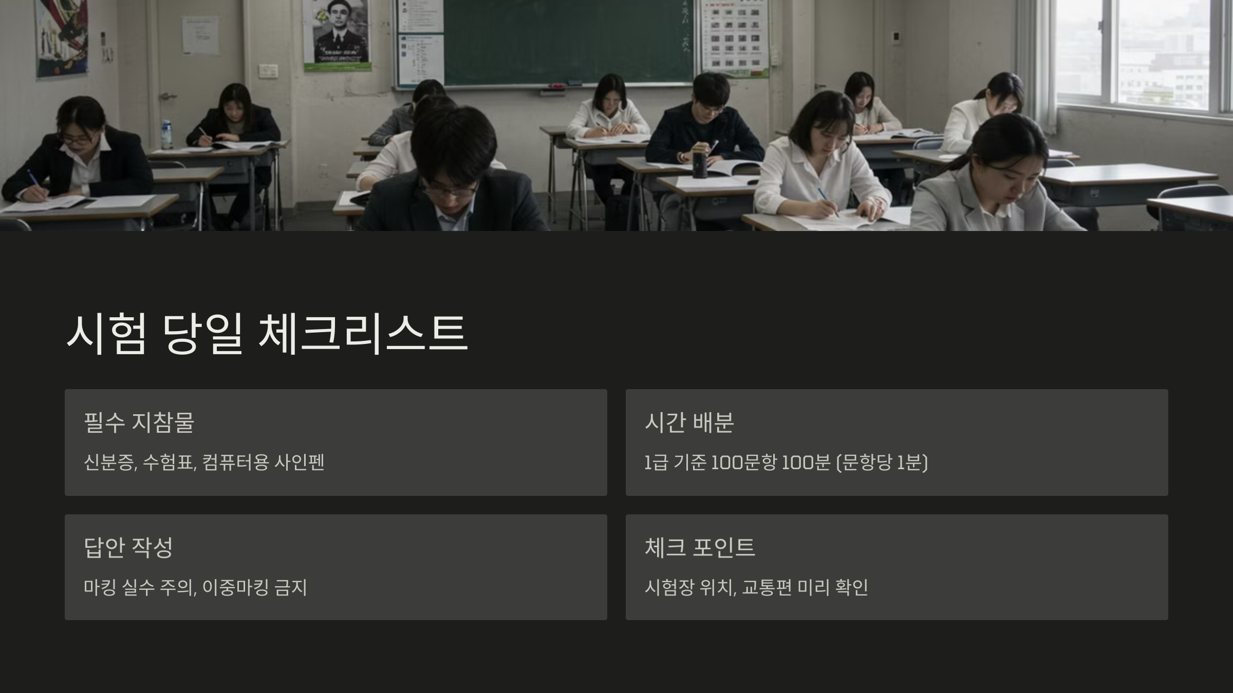 한국사 능력검정시험 당일에는 수험표와 신분증을 꼭 챙겨야 해요! 또한, 시간 관리를 잘해야 실수를 줄이고 고득점을 받을 수 있어요. ⏰📖
