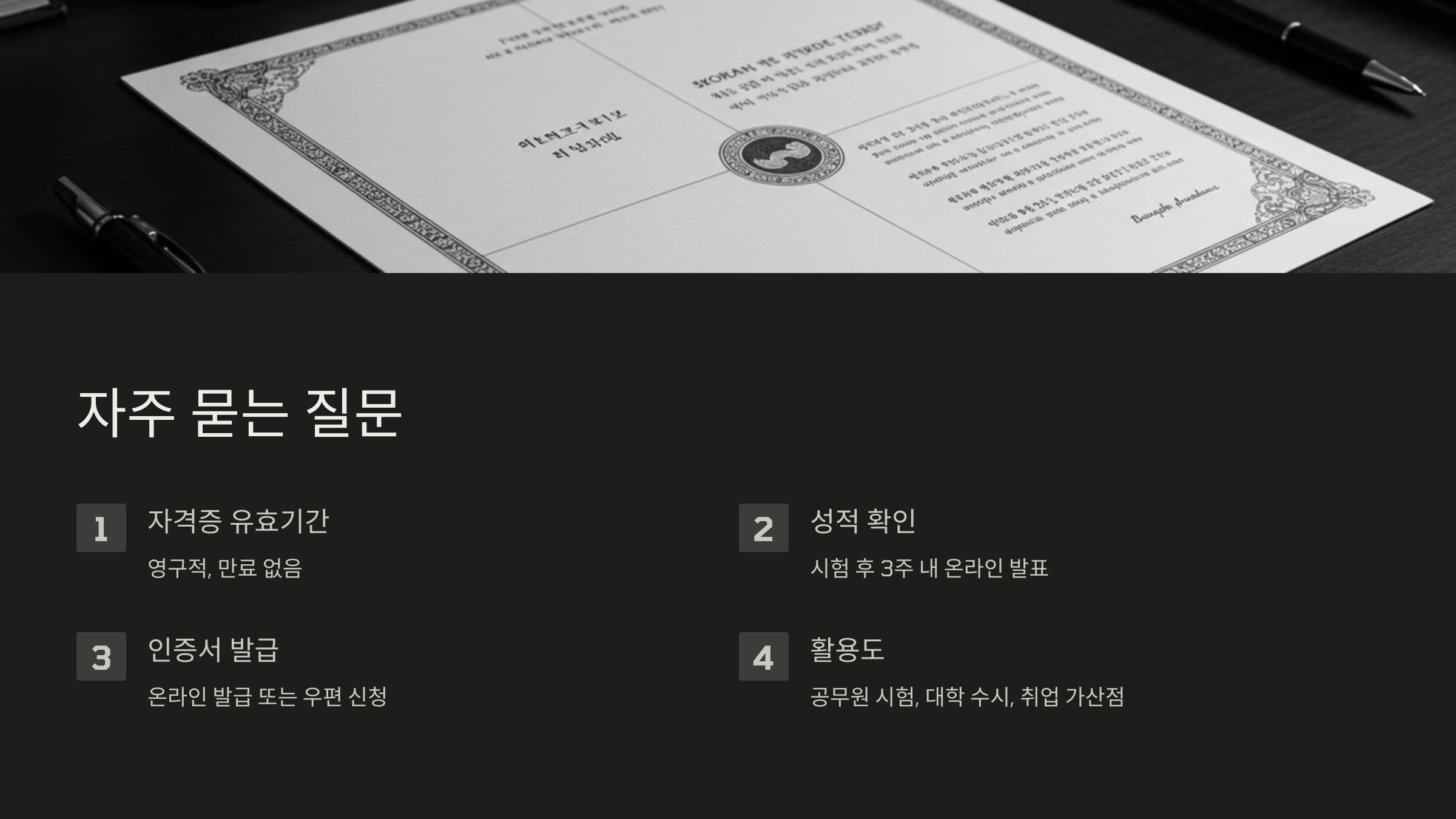 A3. 한능검 자격증은 평생 유효해요. 하지만 일부 기관(공기업, 임용 시험)에서는 2~3년 내 취득한 성적만 인정하는 경우도 있으니 확인이 필요해요.