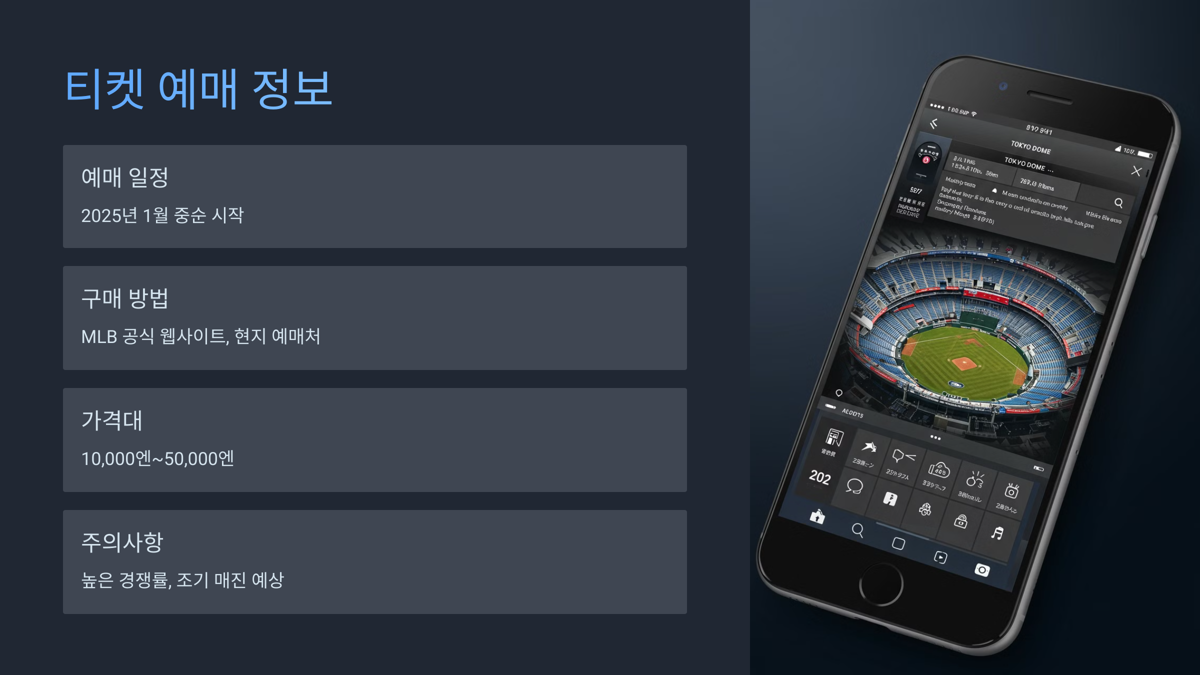 ✔️ 공식 예매처: MLB 공식 홈페이지(MLB.com), 일본 티켓 예매 사이트 (예: 로손 티켓, e플러스)