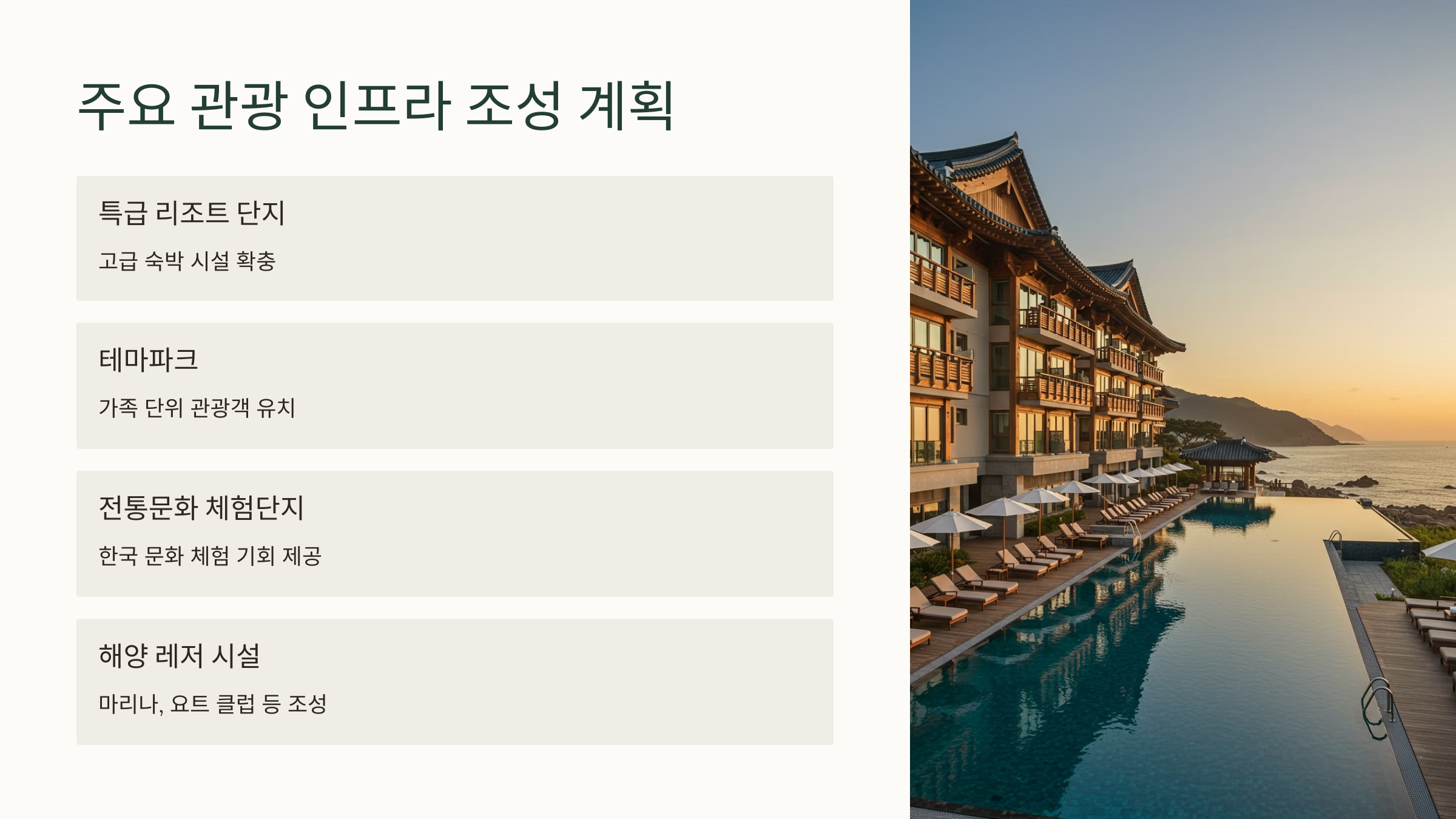 | 숙박·체험 | 특급 리조트, 전통문화 체험단지 조성 | 체류 관광 활성화 |