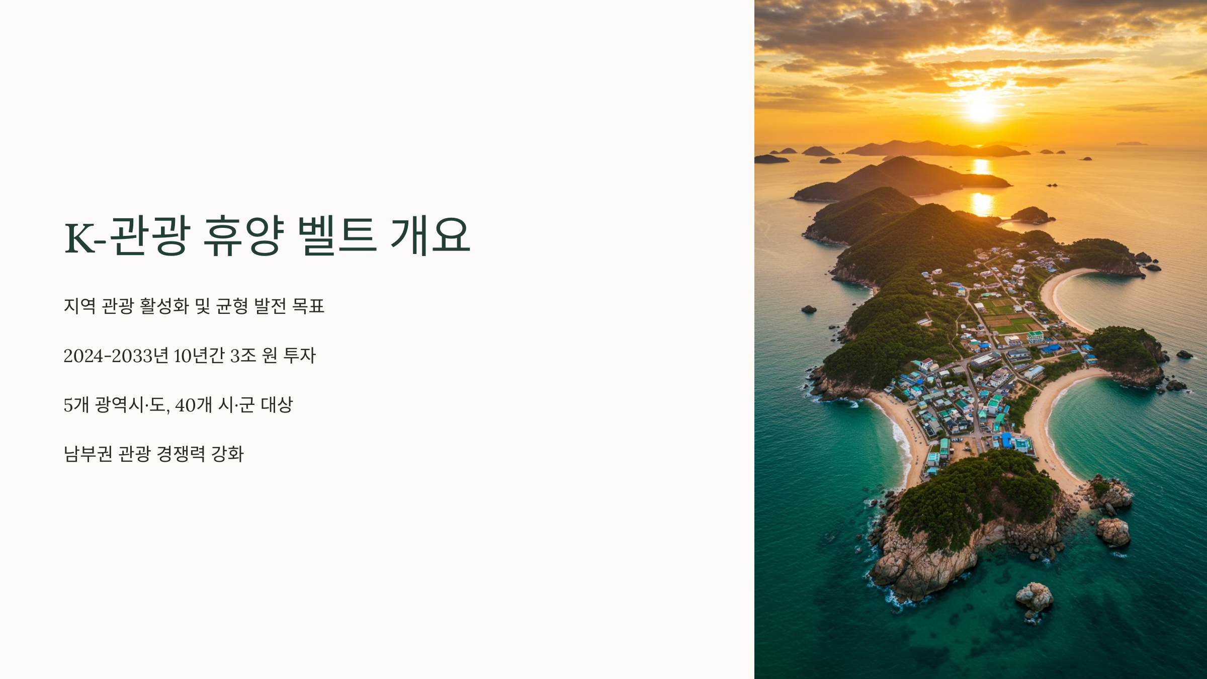 국내 관광산업을 활성화하기 위해 정부가 'K-관광 휴양 벨트' 프로젝트를 추진해요! 🌍🚀