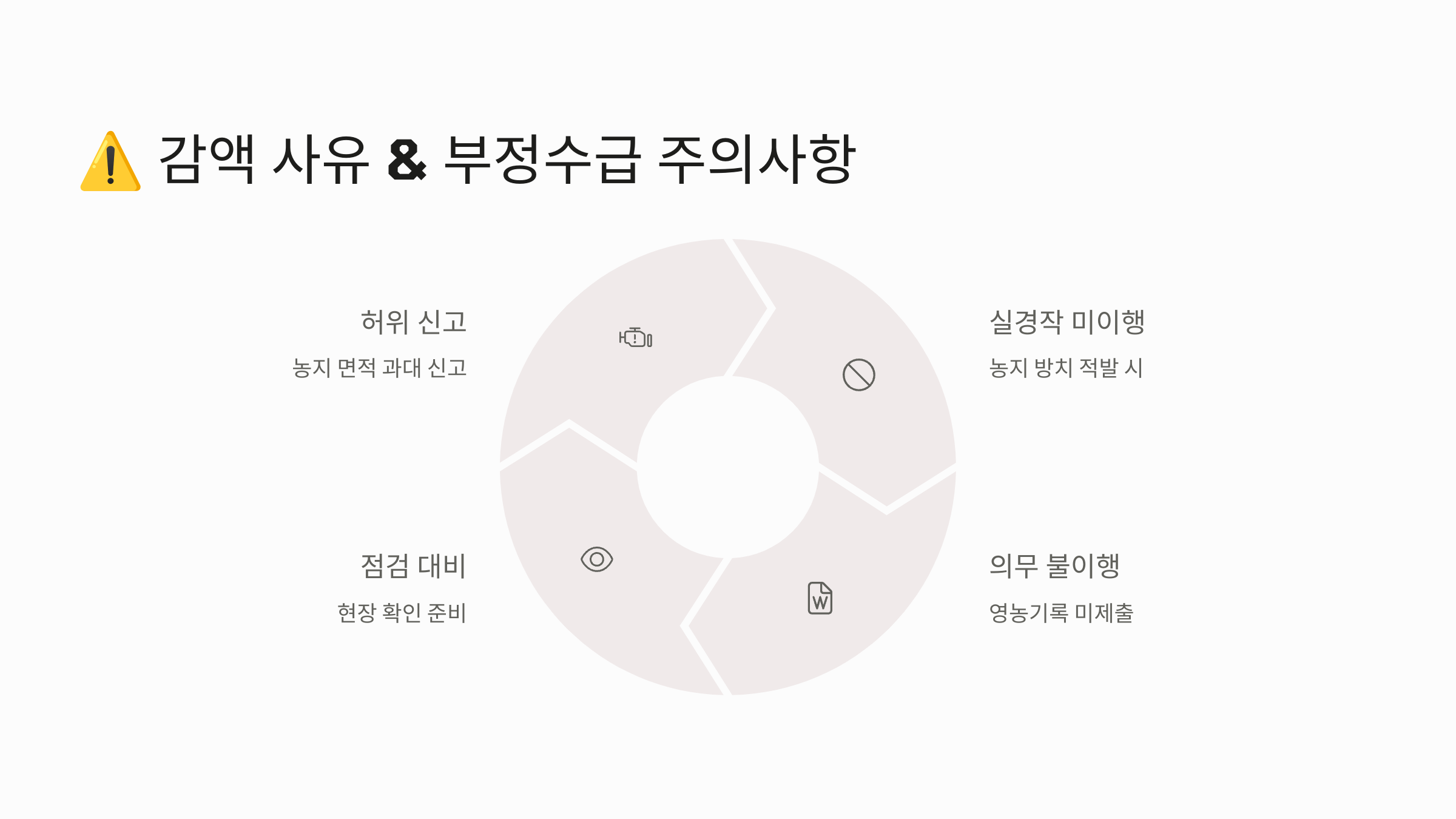 부정수급은 훨씬 더 큰 문제가 돼요. 허위신고나 타인 명의 농지 신청, 자격 요건을 갖추지 못했음에도 거짓으로 수령한 경우는 전액 환수 및 과태료 부과는 물론이고 형사처벌 대상이 될 수도 있어요.