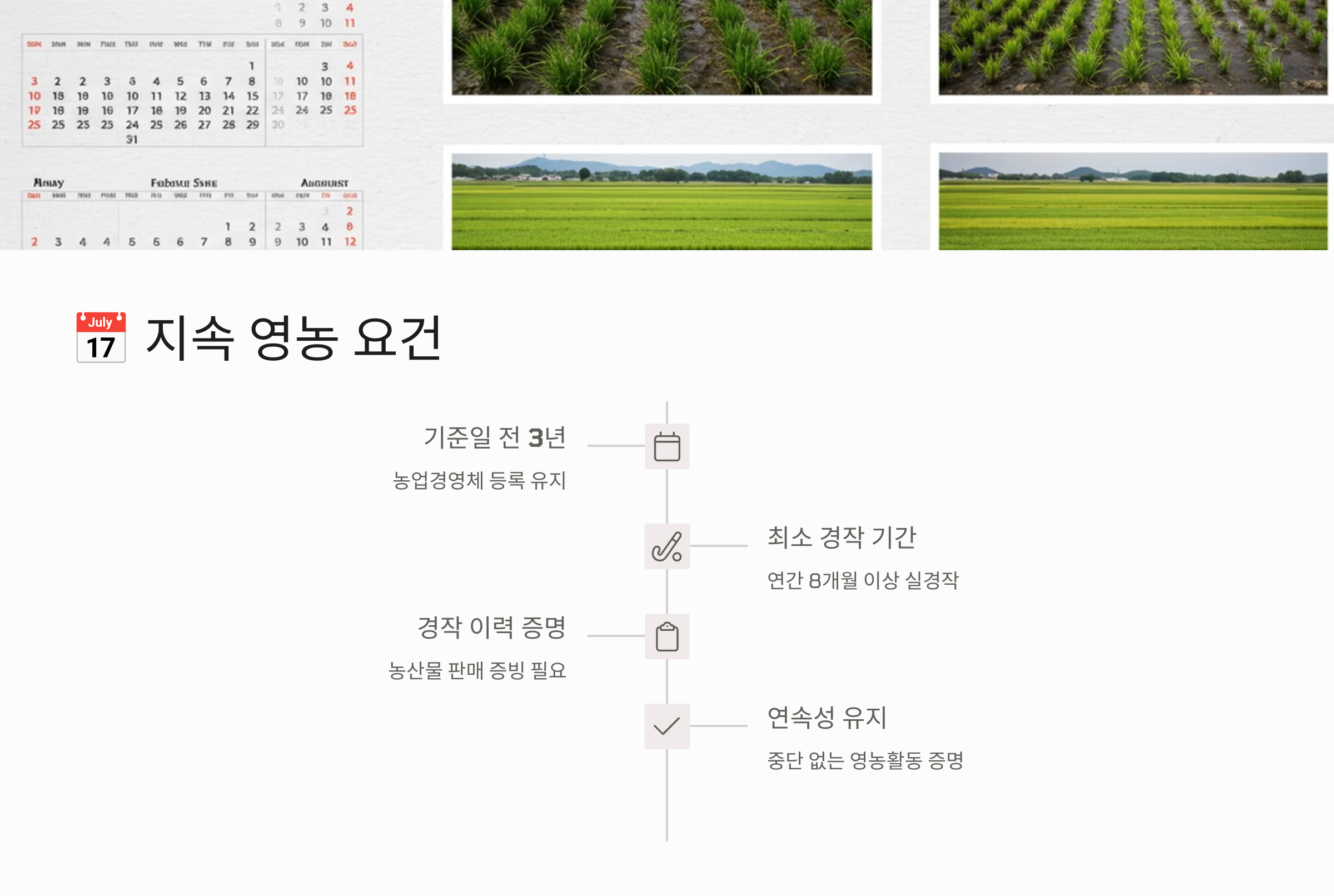 📅 지속 영농 요건 – 최소 경작 기간 및 경작 이력 필요