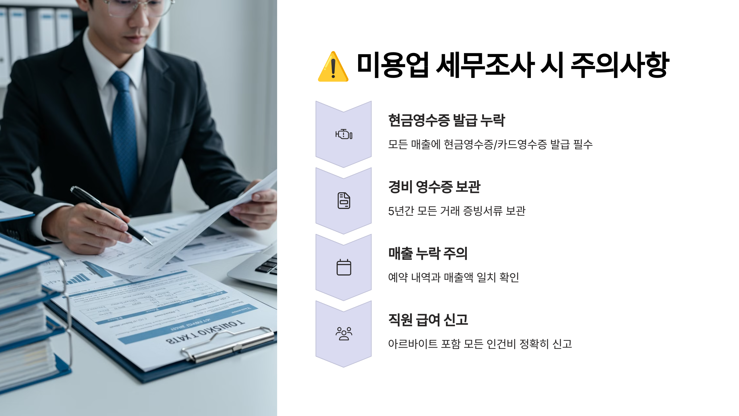 마지막으로 꼭 짚고 넘어가야 할 부분이 있어요. 바로 세무조사예요. “설마 내가 걸리겠어?”라고 생각하실 수 있지만, 미용업은 국세청이 특별관리하는 업종이에요. 특히 현금 거래가 많은 업종이라 더 주의가 필요해요.