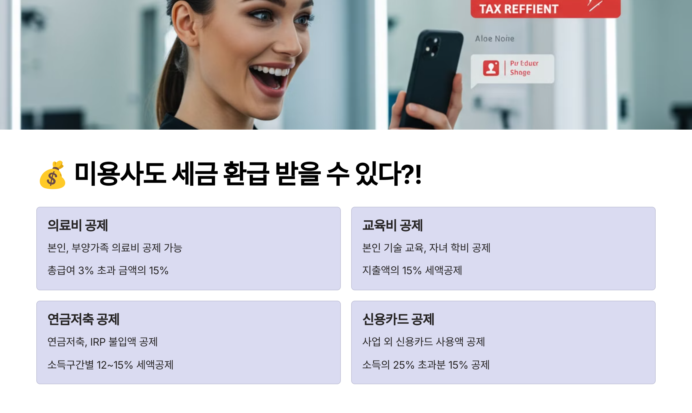 “나는 세금 내는 것도 부담인데, 환급은 나랑 상관없지 않나요?”라고 생각하셨다면, 이제부터는 생각을 바꿔야 해요! 미용사분들도 충분히 종합소득세 환급 받을 수 있어요. 조건만 맞으면 수십만 원도 가능하답니다.