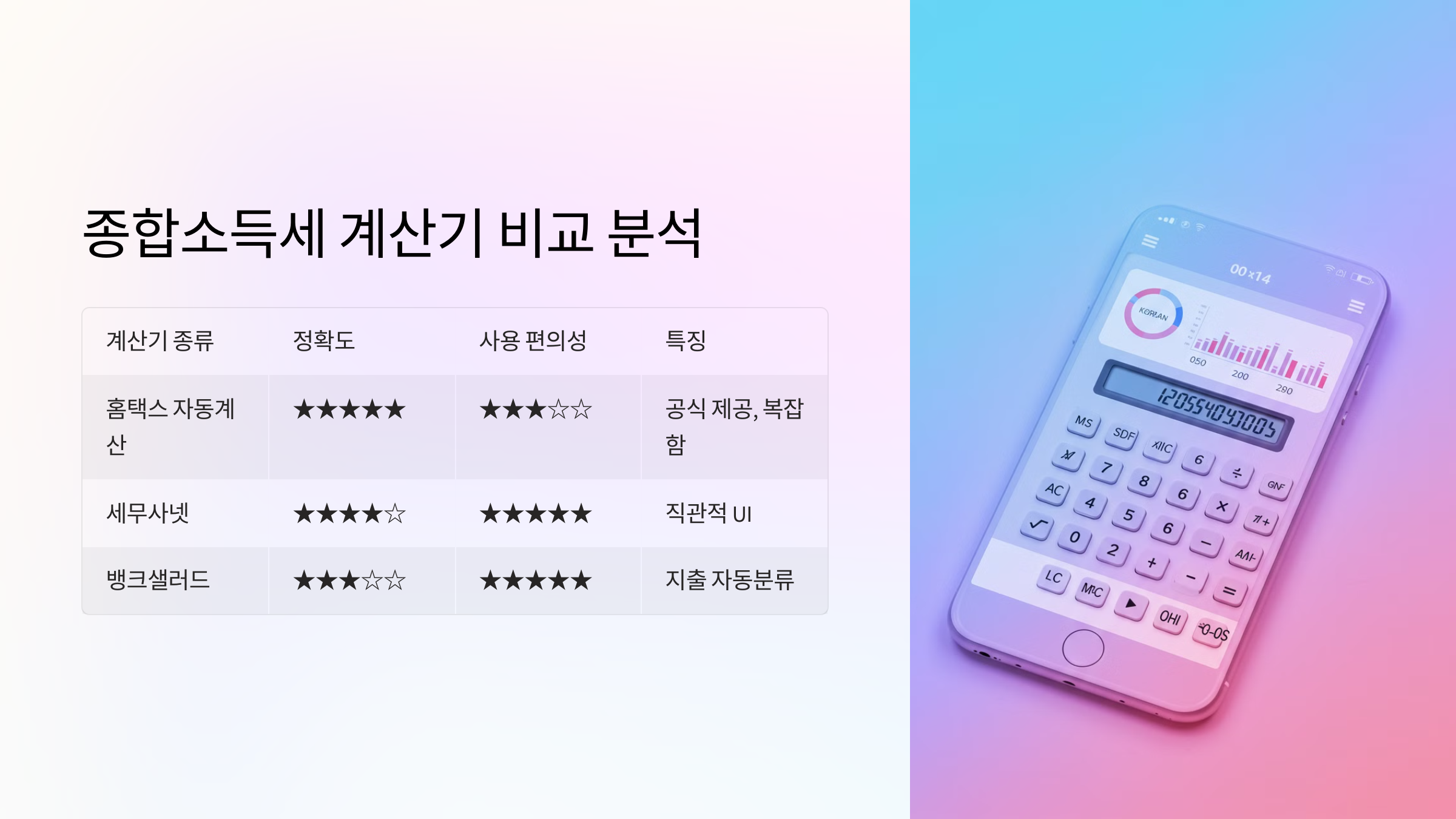 아래 비교표를 보면, 각 계산기의 기능과 편의성을 한눈에 볼 수 있어요. 상황에 따라 적절한 계산기를 선택해서 활용해보세요!