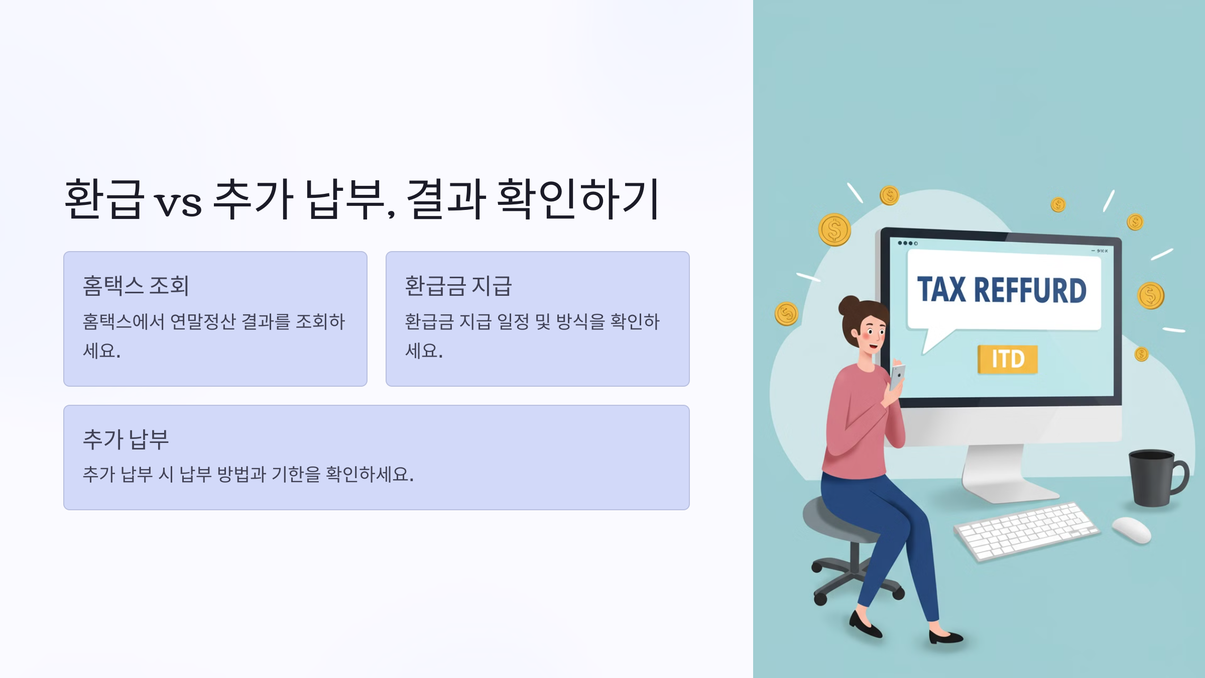 연말정산 결과는 세금을 환급받거나 추가 납부해야 하는 두 가지 경우로 나뉘어요. 홈택스에서 간편하게 확인할 수 있어요! ✅