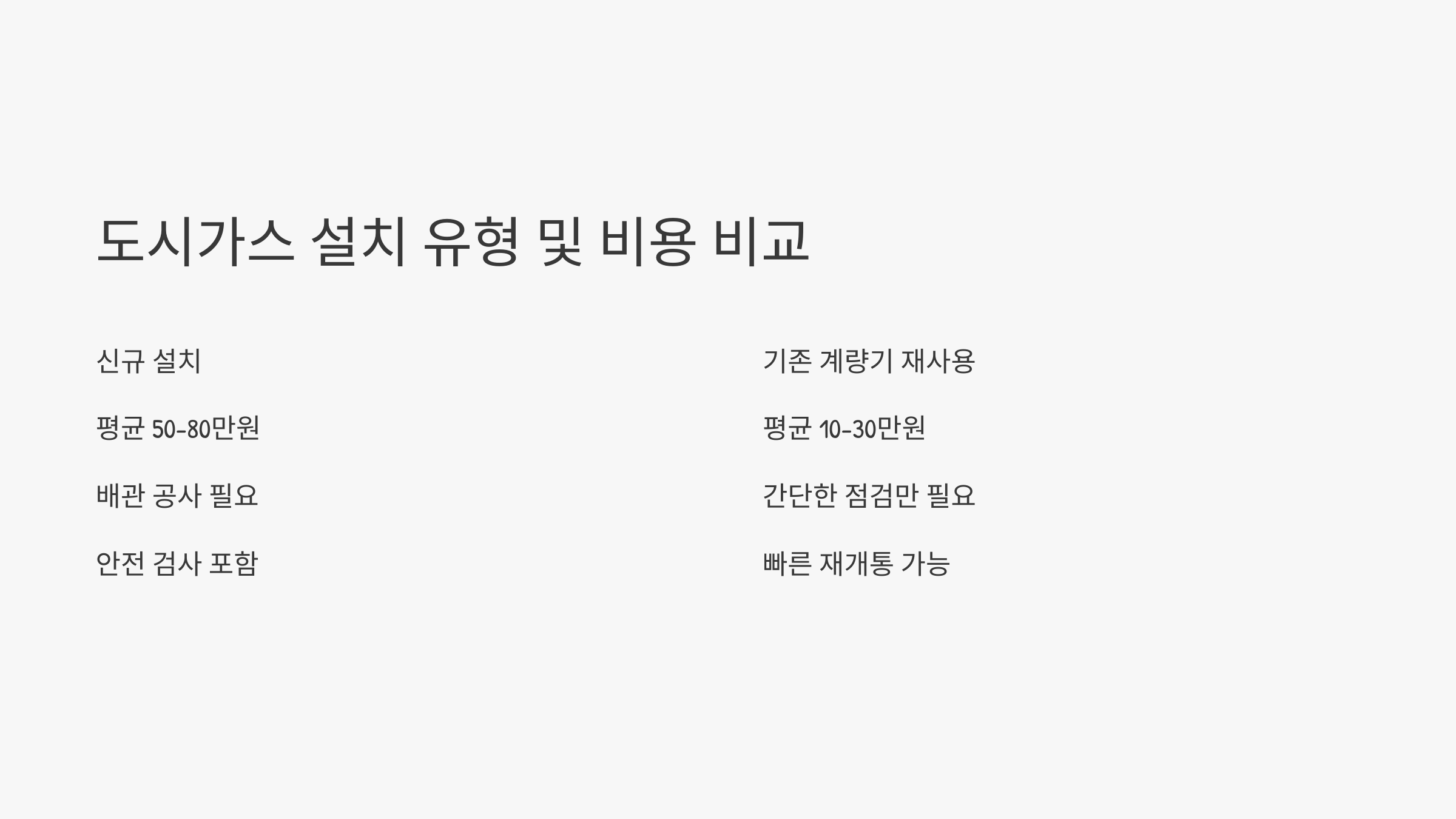 | 필요 작업 | 배관 공사 + 계량기 설치 | 기존 배관 점검 후 연결 |