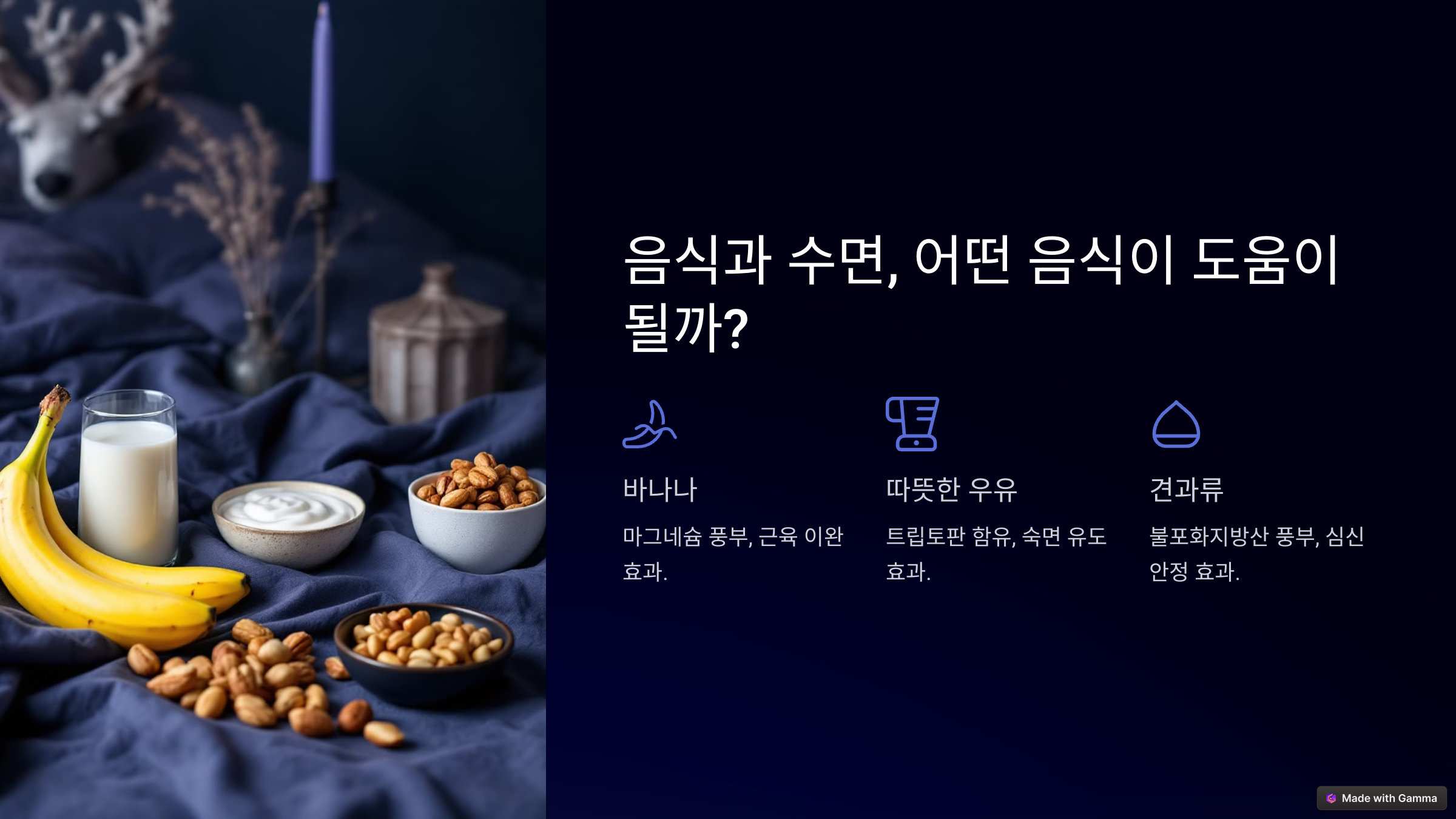 | 트립토판 함유 | 우유, 바나나, 닭고기 | 카페인 음료, 초콜릿 |