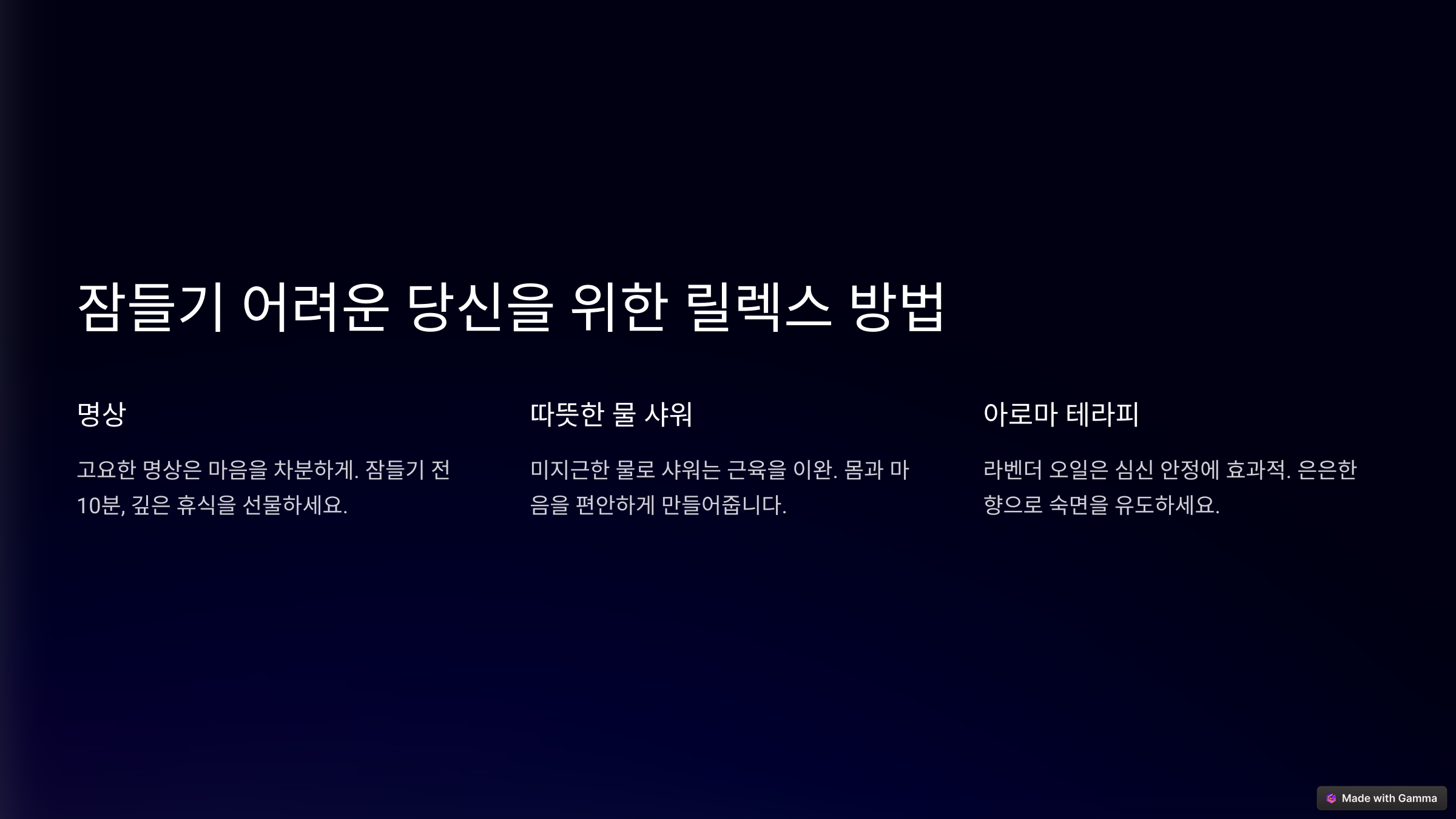잠들기 전에 위의 방법을 하나씩 실천해 보면, 불안한 마음이 가라앉고 숙면을 취할 수 있을 거예요. 오늘 밤부터 한번 시도해 보세요! 😌