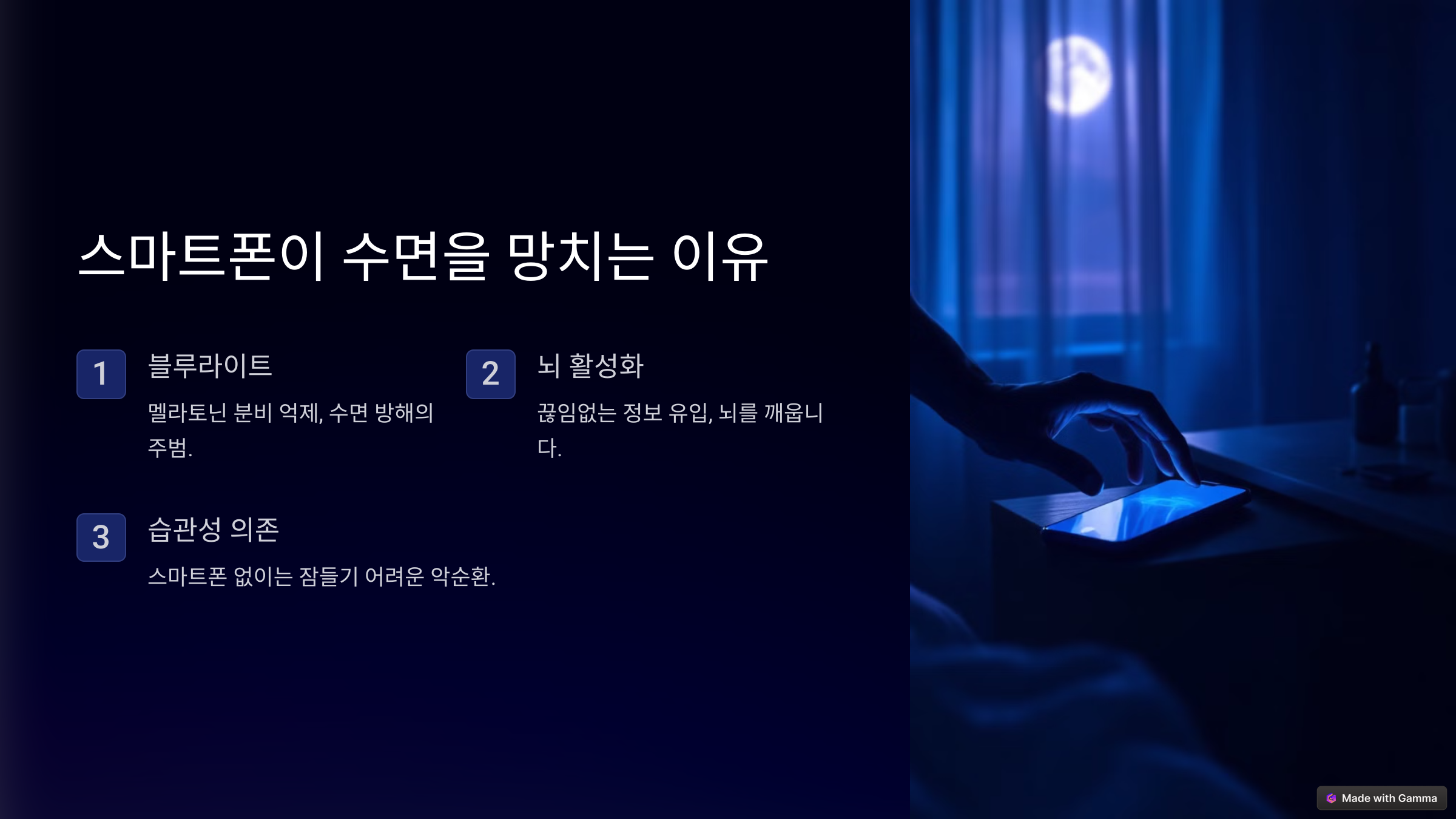 많은 사람들이 자기 전 스마트폰을 사용해요. 하지만 이 습관이 수면의 질을 망치는 주범이라는 사실, 알고 있었나요? 스마트폰은 우리의 뇌를 각성시키고, 숙면을 방해하는 다양한 문제를 일으켜요.