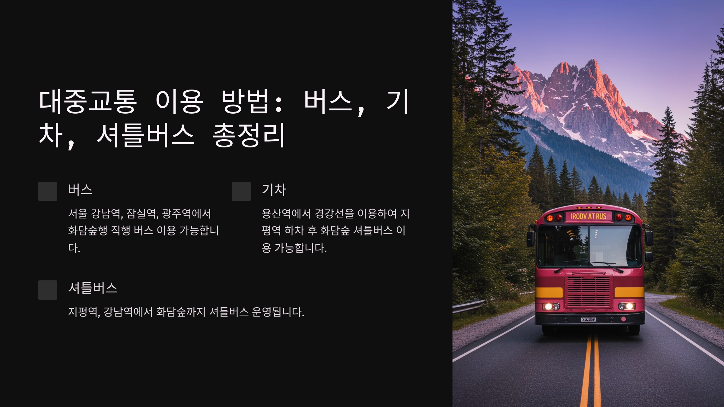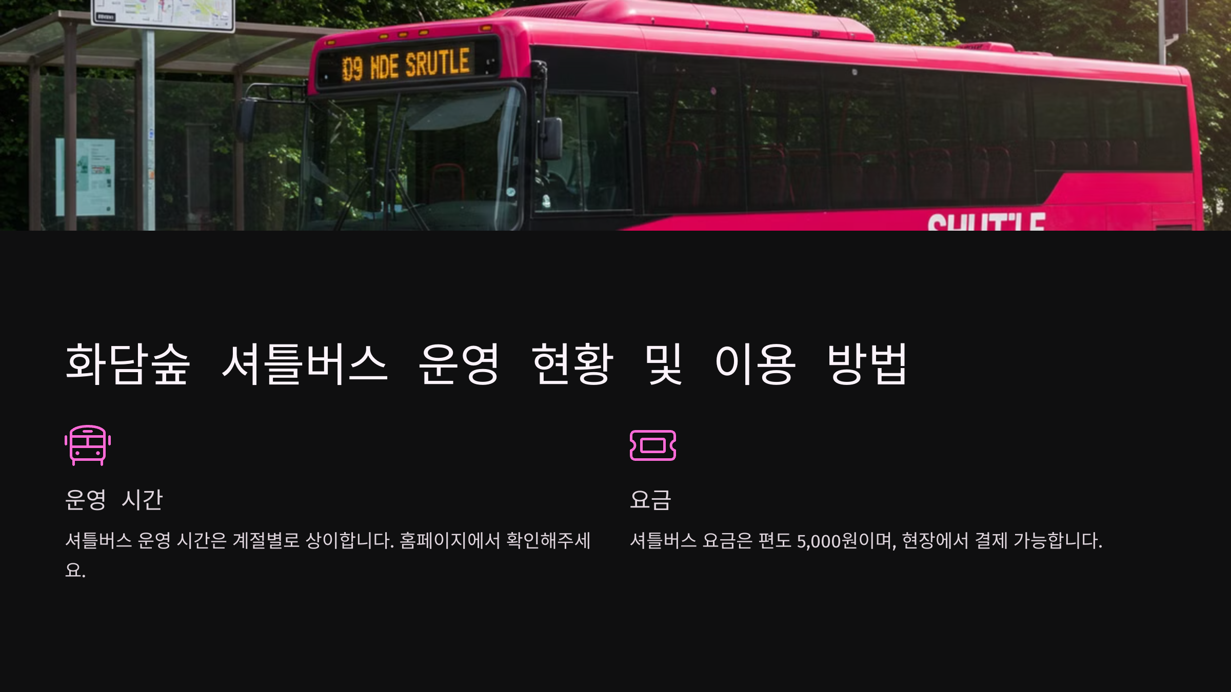 🚍 교통 체증을 피하려면 셔틀버스를 이용하는 것도 방법이에요. 다음 섹션에서 화담숲 셔틀버스 운영 정보를 알려드릴게요!