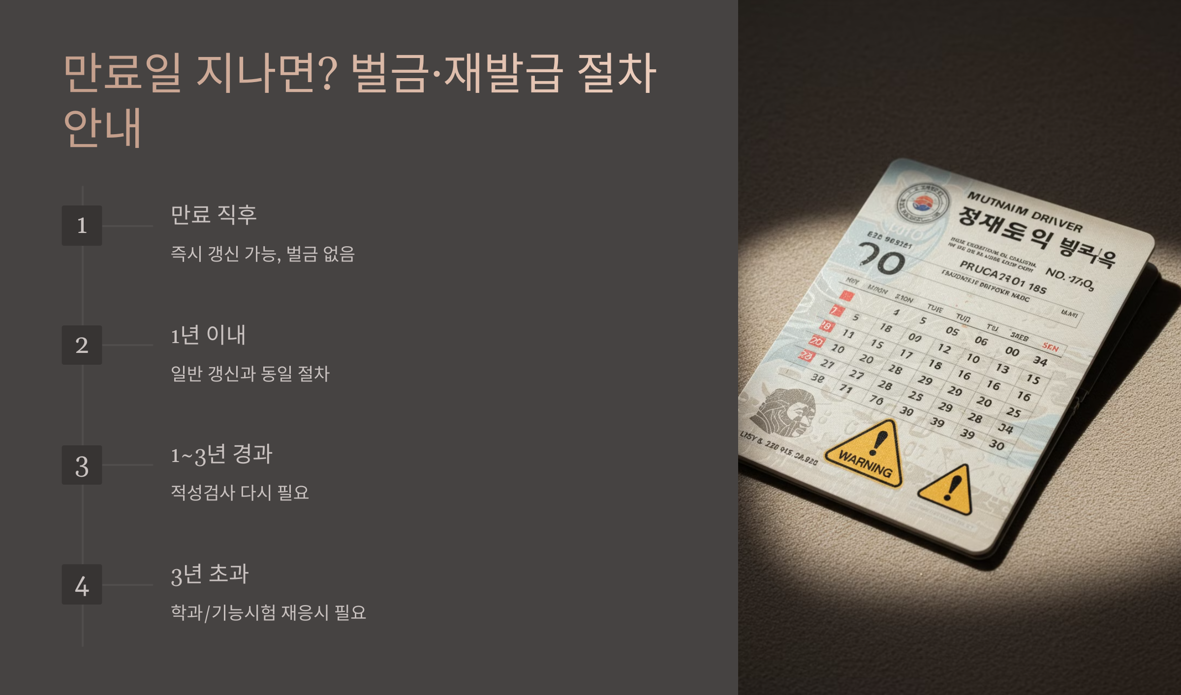 💡 TIP! 만료 후 1년 이내라면 간단한 절차로 갱신이 가능하지만, 2년이 지나면 면허 취소되므로 반드시 기한 내 갱신하세요! ⏳