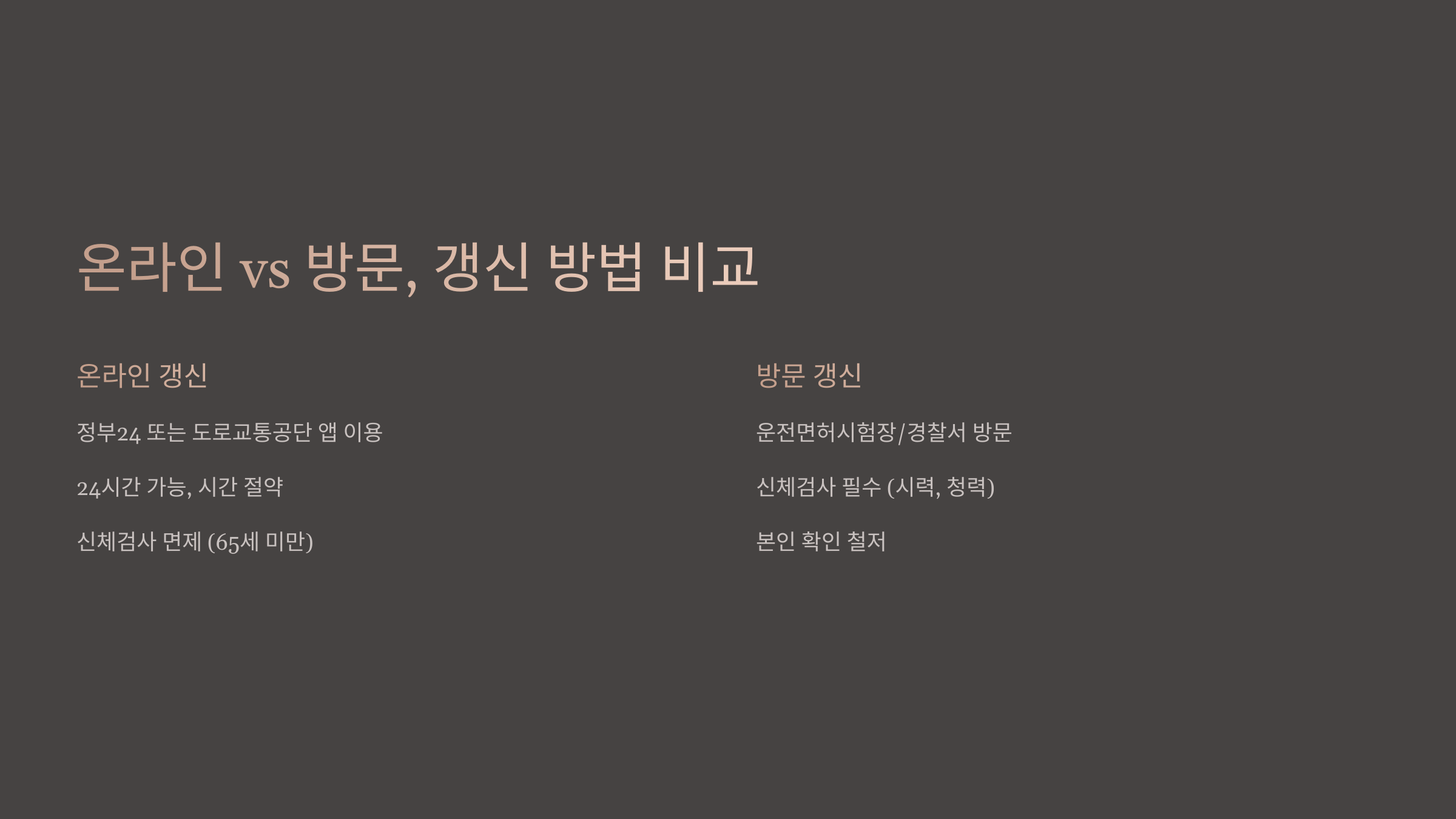 | 갱신 방법 | 방문 갱신 (운전면허시험장, 경찰서) | 온라인 또는 방문 갱신 |