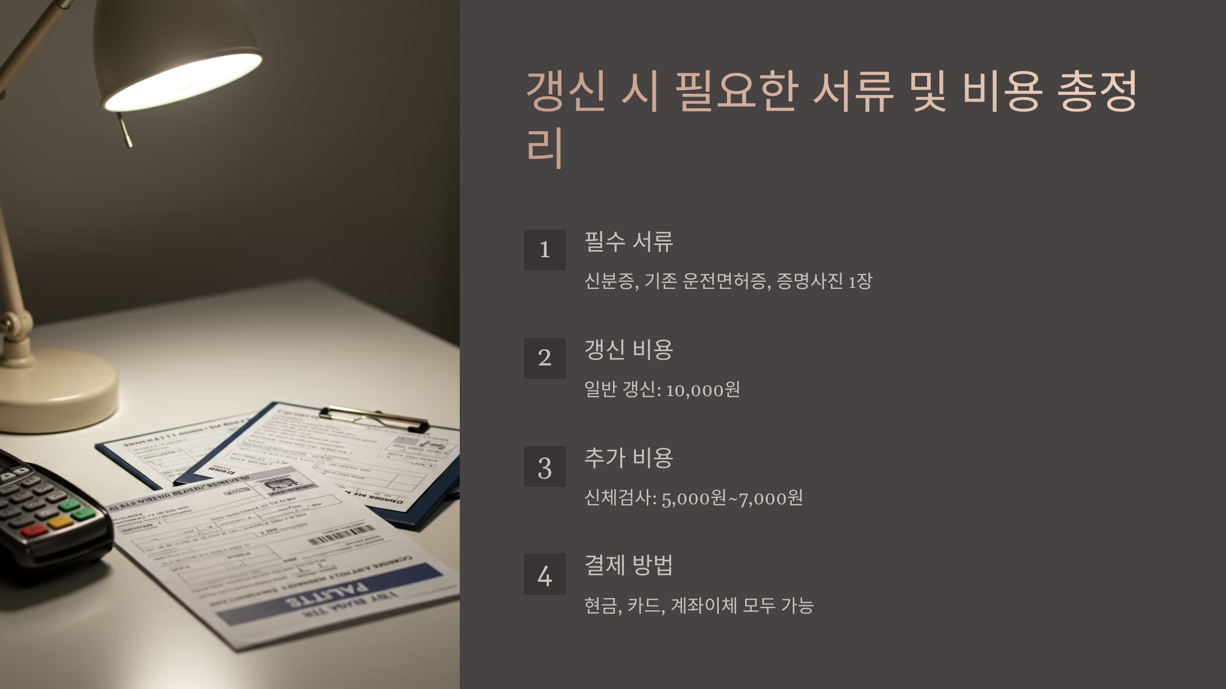 운전면허 갱신을 위해서는 몇 가지 필수 서류를 준비해야 해요. 또한, 갱신 비용은 면허 종류에 따라 다를 수 있어요. 🚗