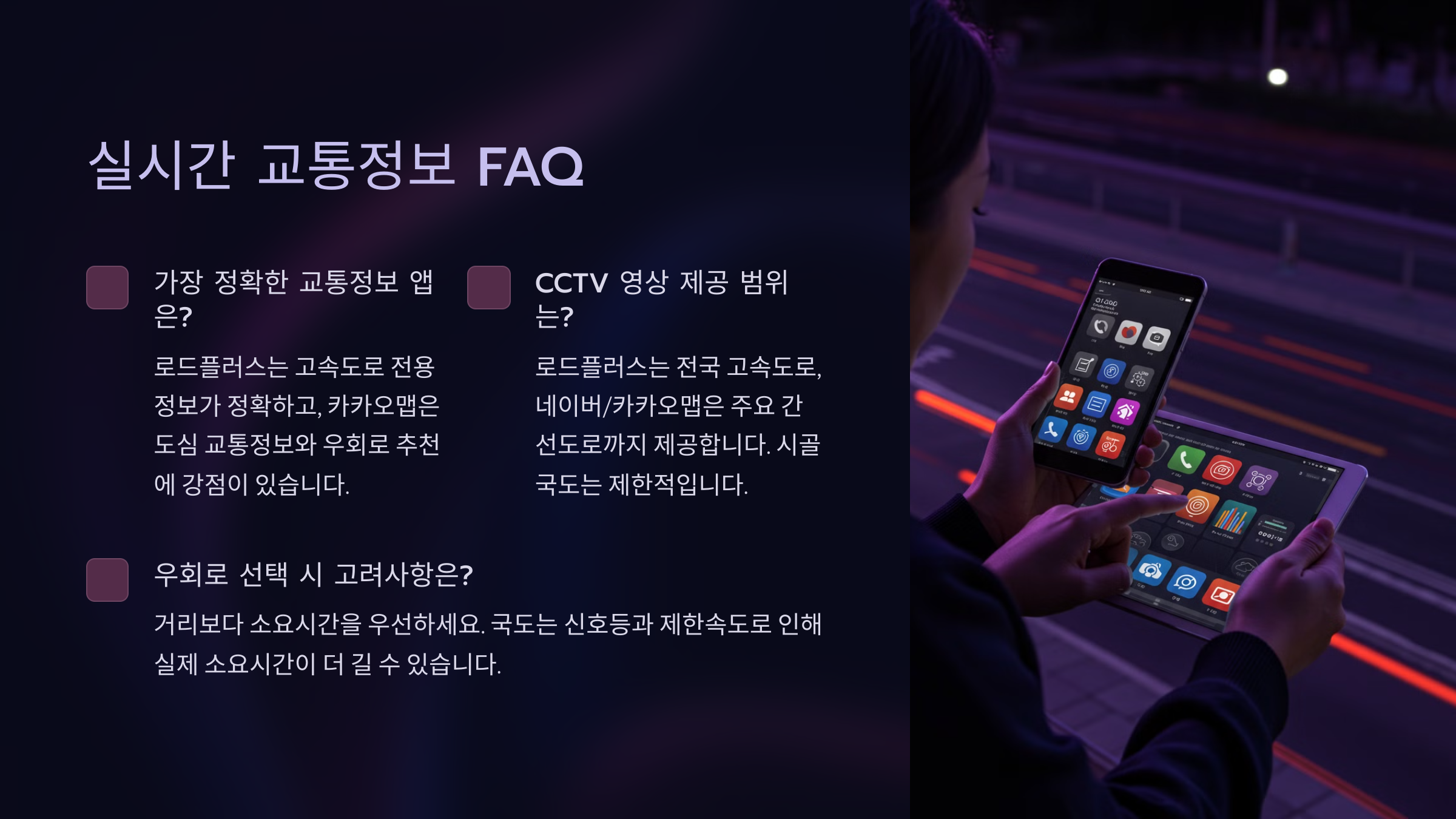 A5. 로드플러스에서 사고·공사 정보를 실시간으로 제공해요. T맵은 사용자 신고 기능이 있어 돌발 상황을 빠르게 확인할 수 있어요.