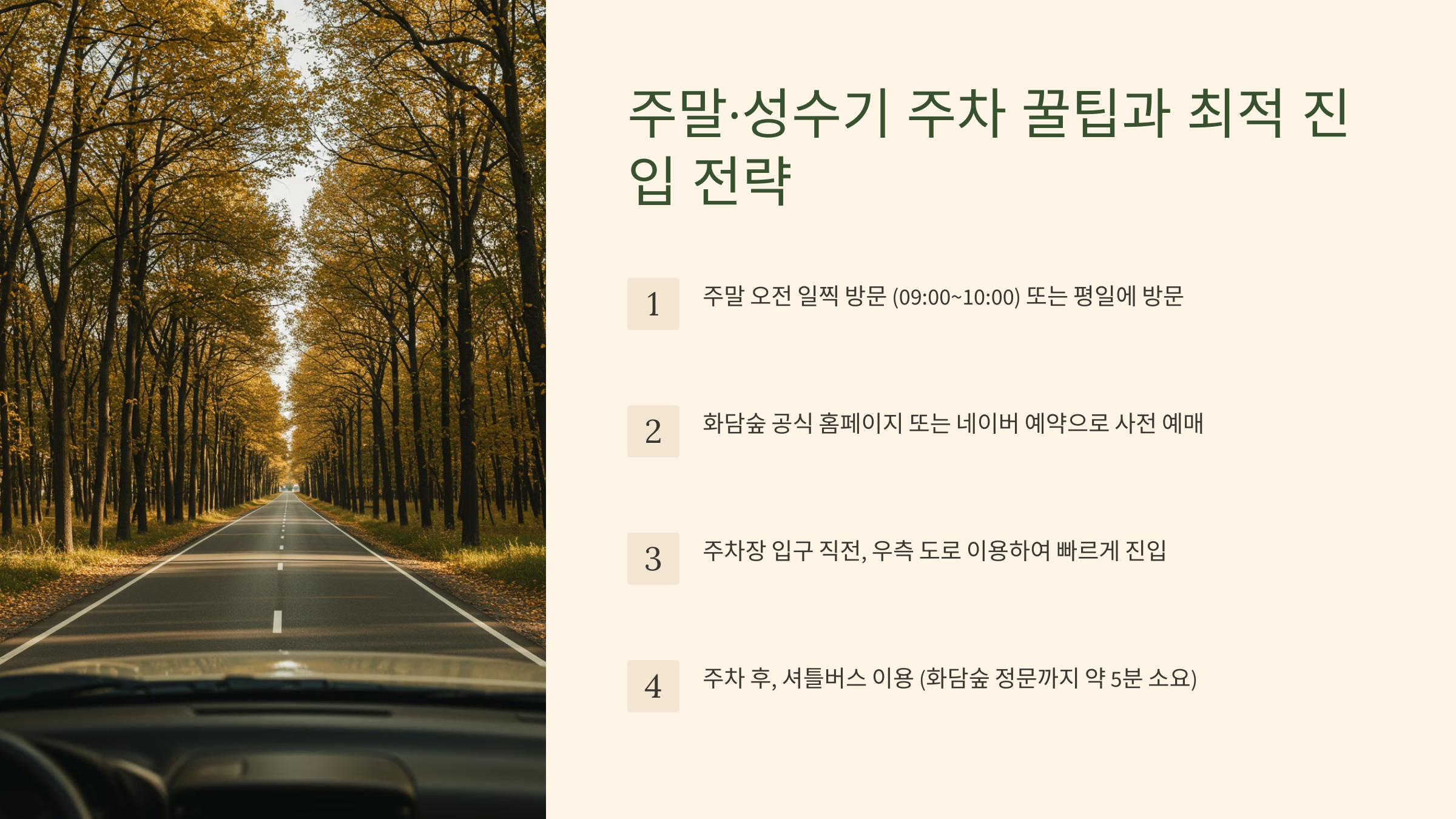 화담숲 주말·성수기(봄 벚꽃 시즌, 가을 단풍 시즌)에는 주차장이 아침 10시 이전에 만차되는 경우가 많아요. 주차 시간을 줄이려면 몇 가지 꿀팁을 알아두는 것이 중요해요! 🚗
