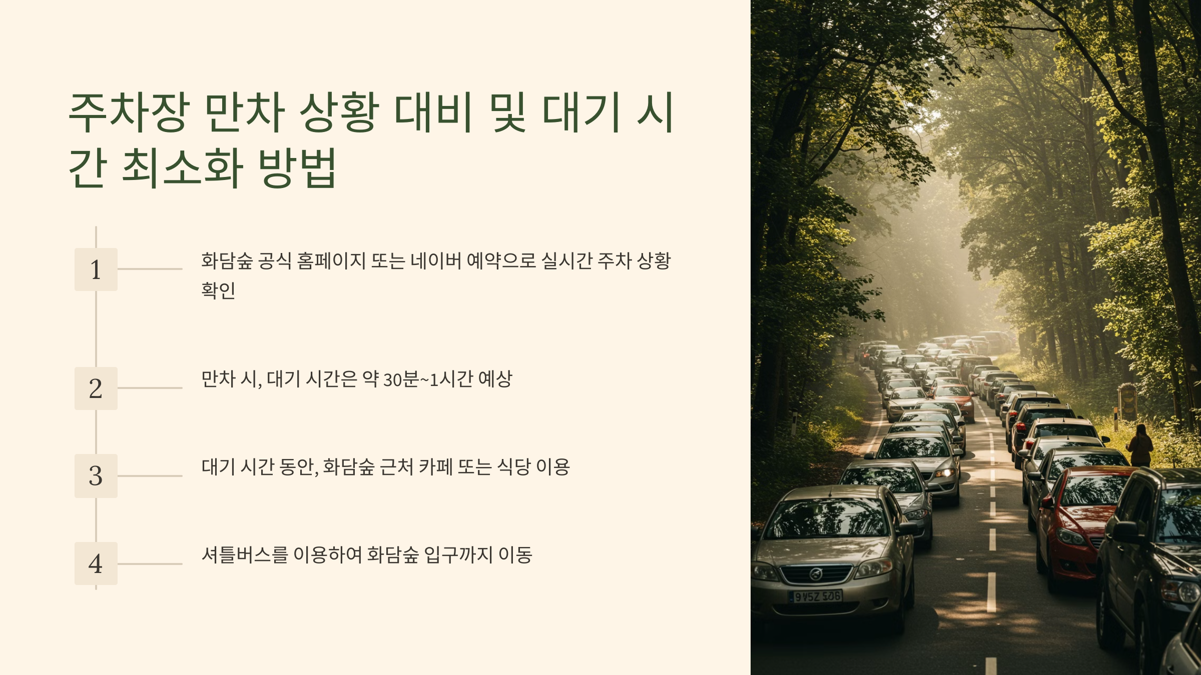 화담숲 주차장이 만차되면 대기 시간이 30분~1시간 이상 걸릴 수도 있어요. 하지만 대기 시간을 최소화하는 몇 가지 방법을 알면 시간을 절약할 수 있어요! 🚗⏳
