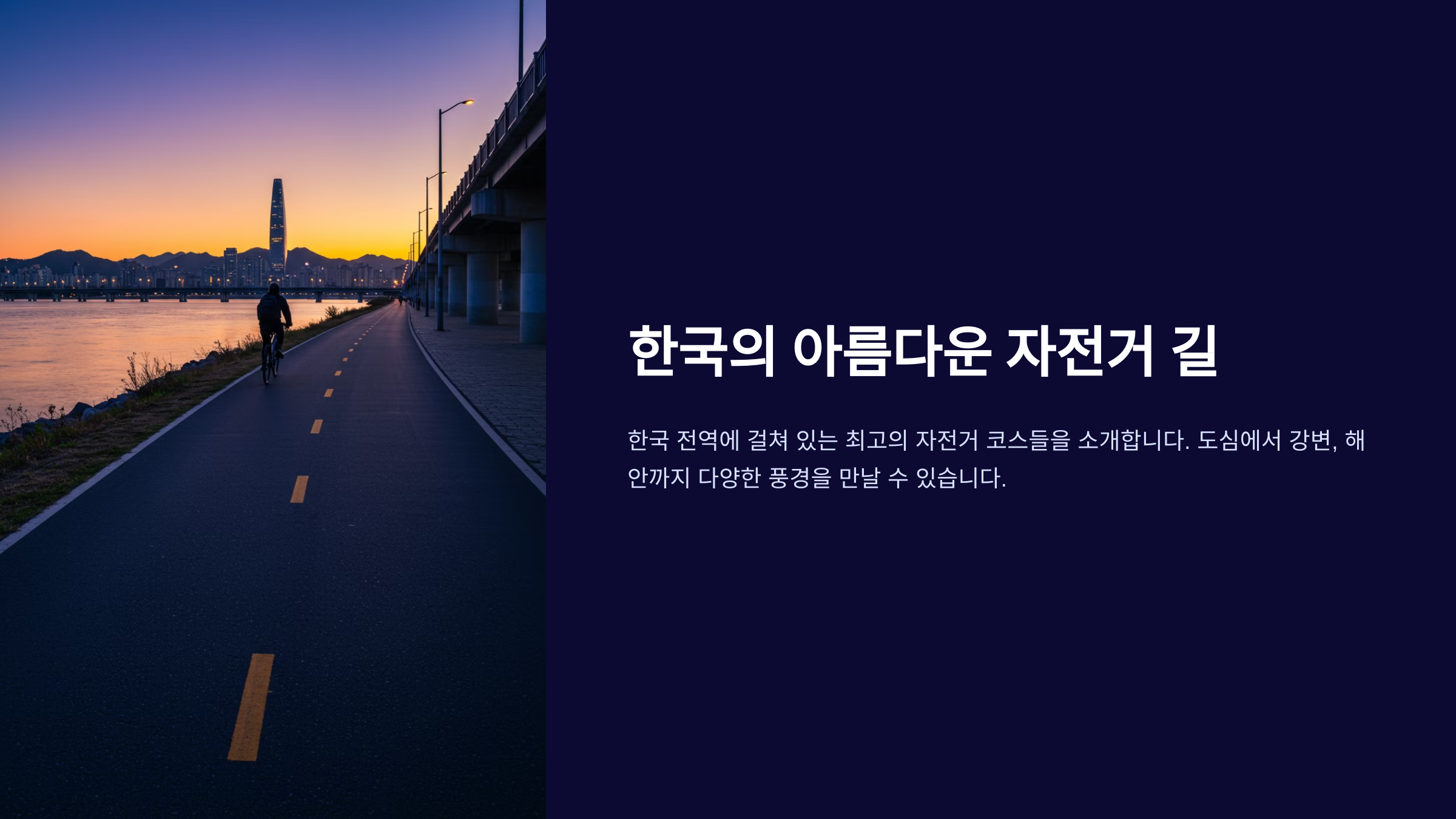 "한번쯤 떠나보고 싶은 자전거 여행!" 🚴♂️ 자유롭게 달리며 자연과 풍경을 즐기는 자전거 여행은 최고의 힐링이죠. 한국에는 강변, 해안도로, 산길까지 다양한 자전거 코스가 있어요.