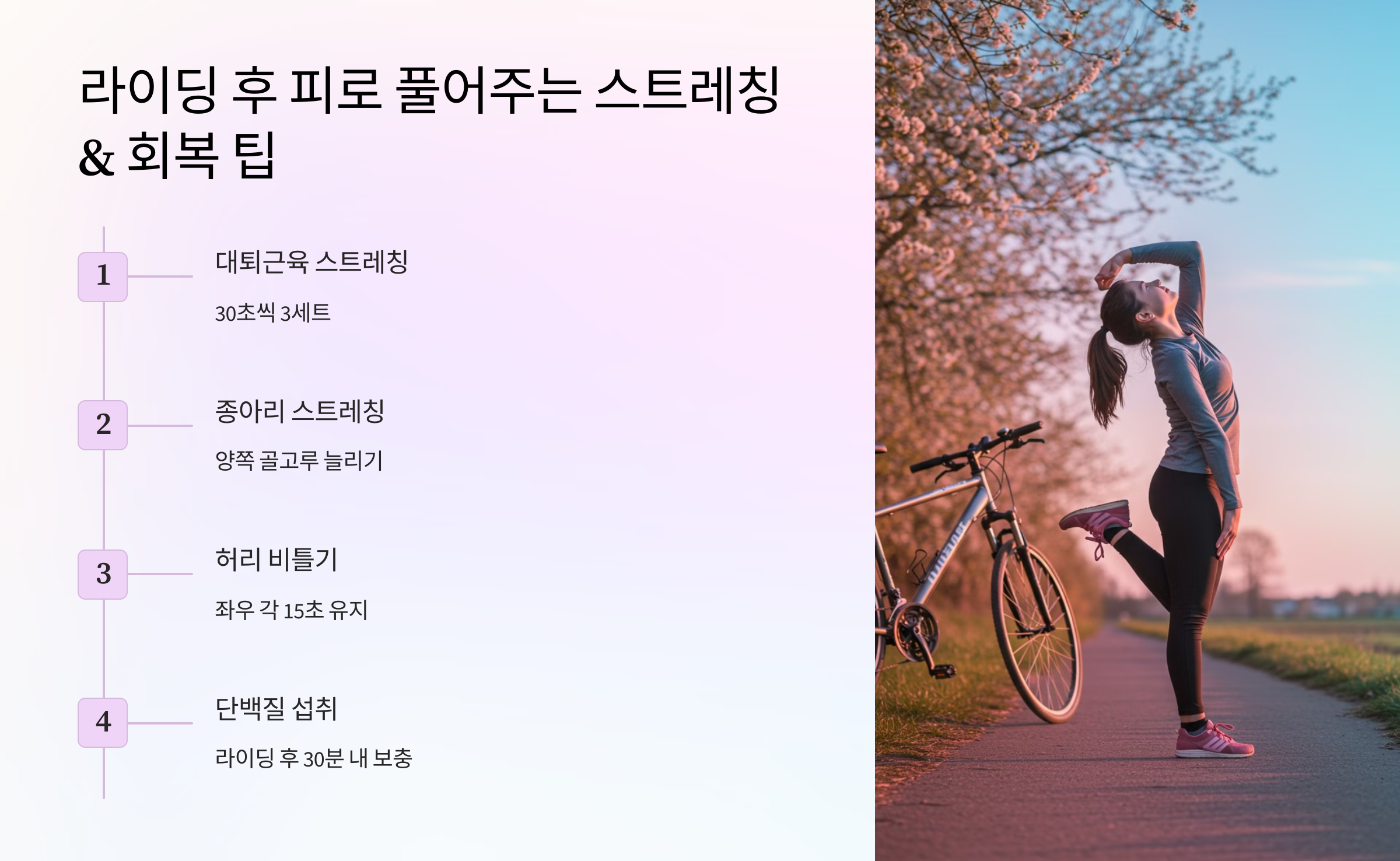 다음으로, 라이딩 후 피로를 풀어주는 스트레칭 & 회복 팁을 알아볼까요? 🏋️♂️🚴♂️