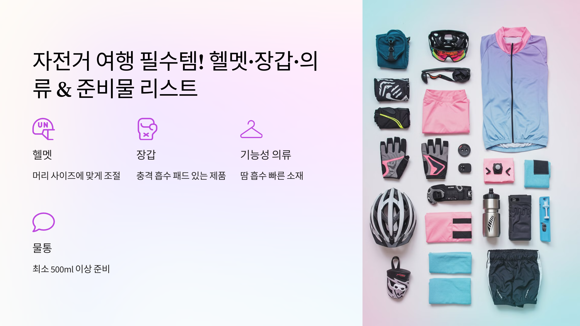 다음으로, 자전거 여행 필수템! 헬멧·장갑·의류 & 준비물 리스트를 알아볼까요? 🎒🚴♂️