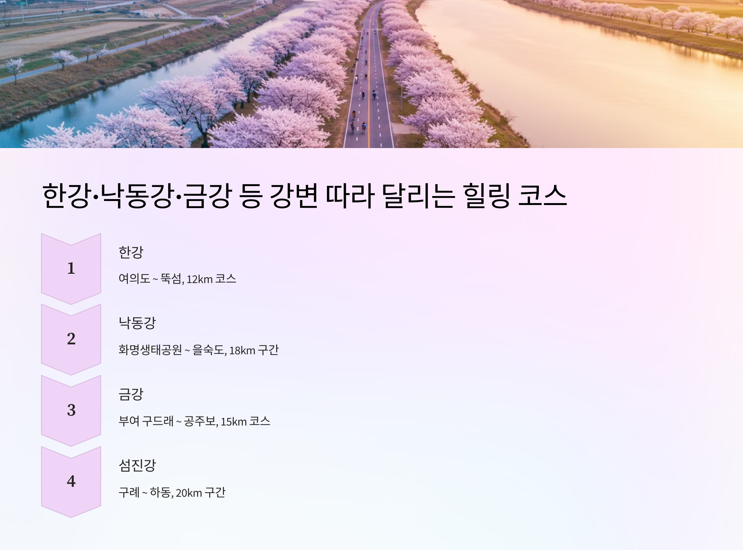 다음으로, 한강·낙동강·금강 등 강변을 따라 달리는 힐링 코스를 알아볼까요? 🚴♂️🌊