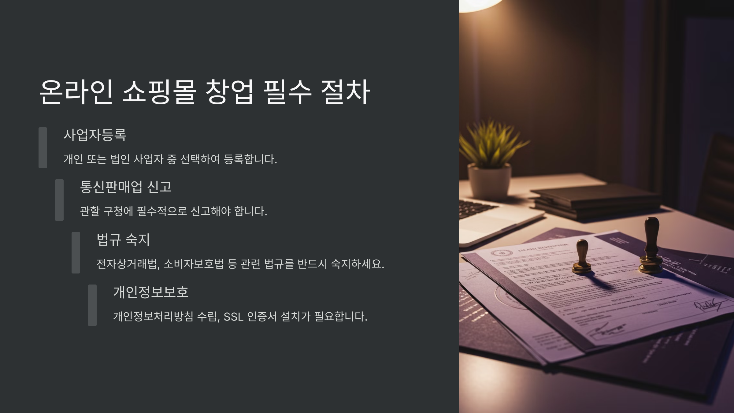 이 절차를 빠르게 완료하면 쇼핑몰을 합법적으로 운영할 수 있어요. 서류 준비만 잘하면 생각보다 어렵지 않답니다! 🚀