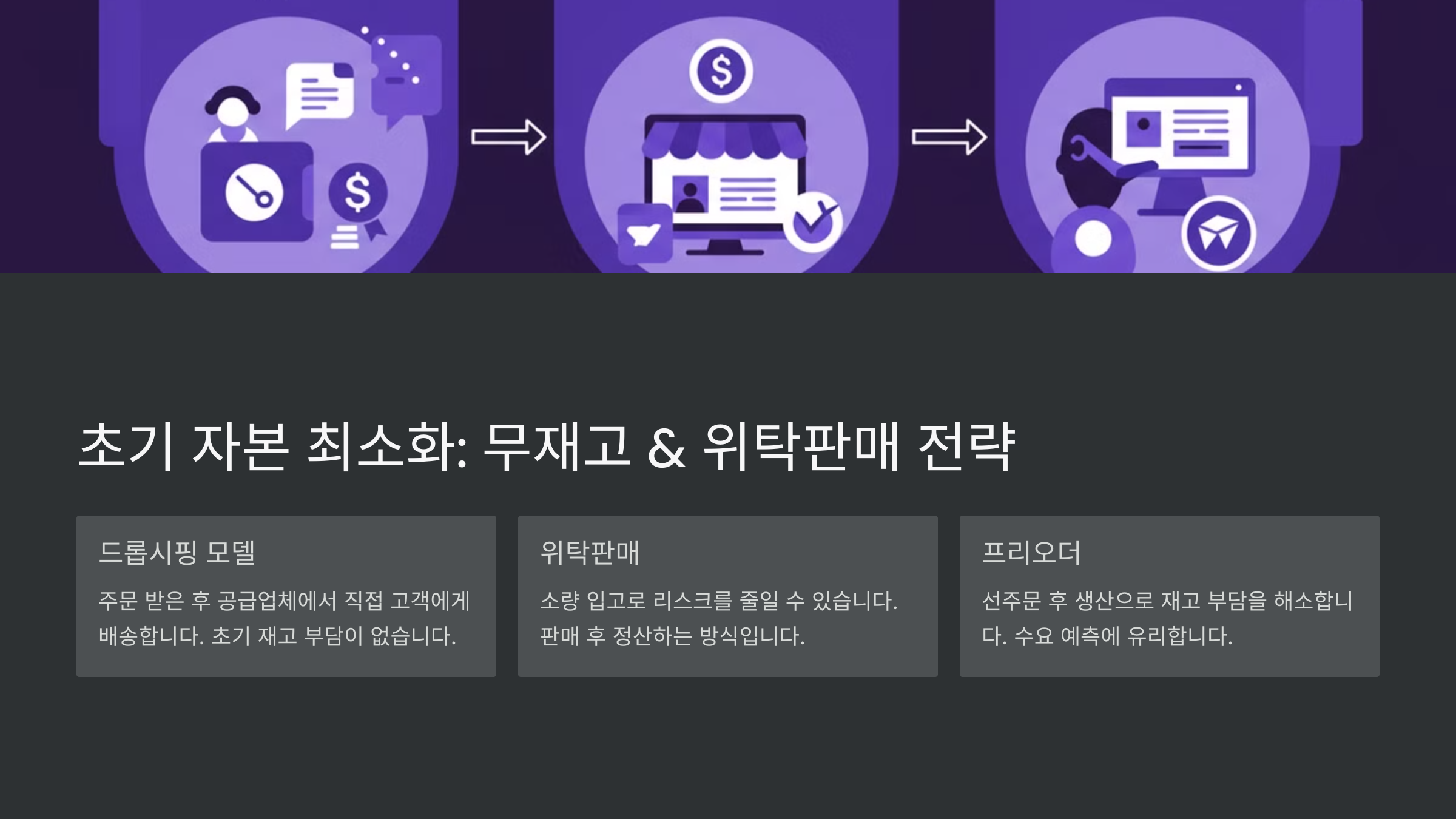 | 무재고 판매 (드롭쉬핑) | 재고 부담 없음, 소자본 창업 가능 | 배송 지연 가능성, 마진 낮음 | 초보 창업자, 소규모 운영 희망자 |