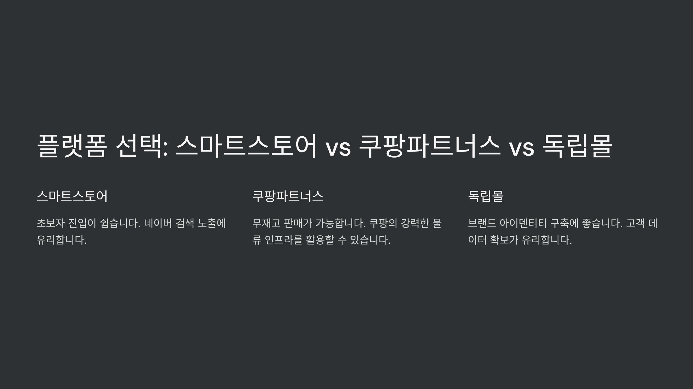내가 생각했을 때, 초보자는 스마트스토어가 진입 장벽이 낮고, 쿠팡파트너스는 재고 부담이 없으며, 독립몰은 브랜드 구축이 가능한 것이 가장 큰 차이점이에요.