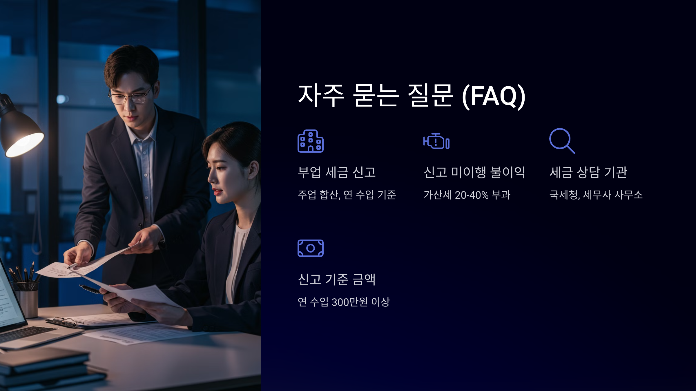 A2. 신고하지 않으면 무신고 가산세(20%)와 납부 불성실 가산세(연 10.95%)가 붙어요. 또한, 신용카드 발급 및 대출에도 불이익이 있을 수 있어요.
