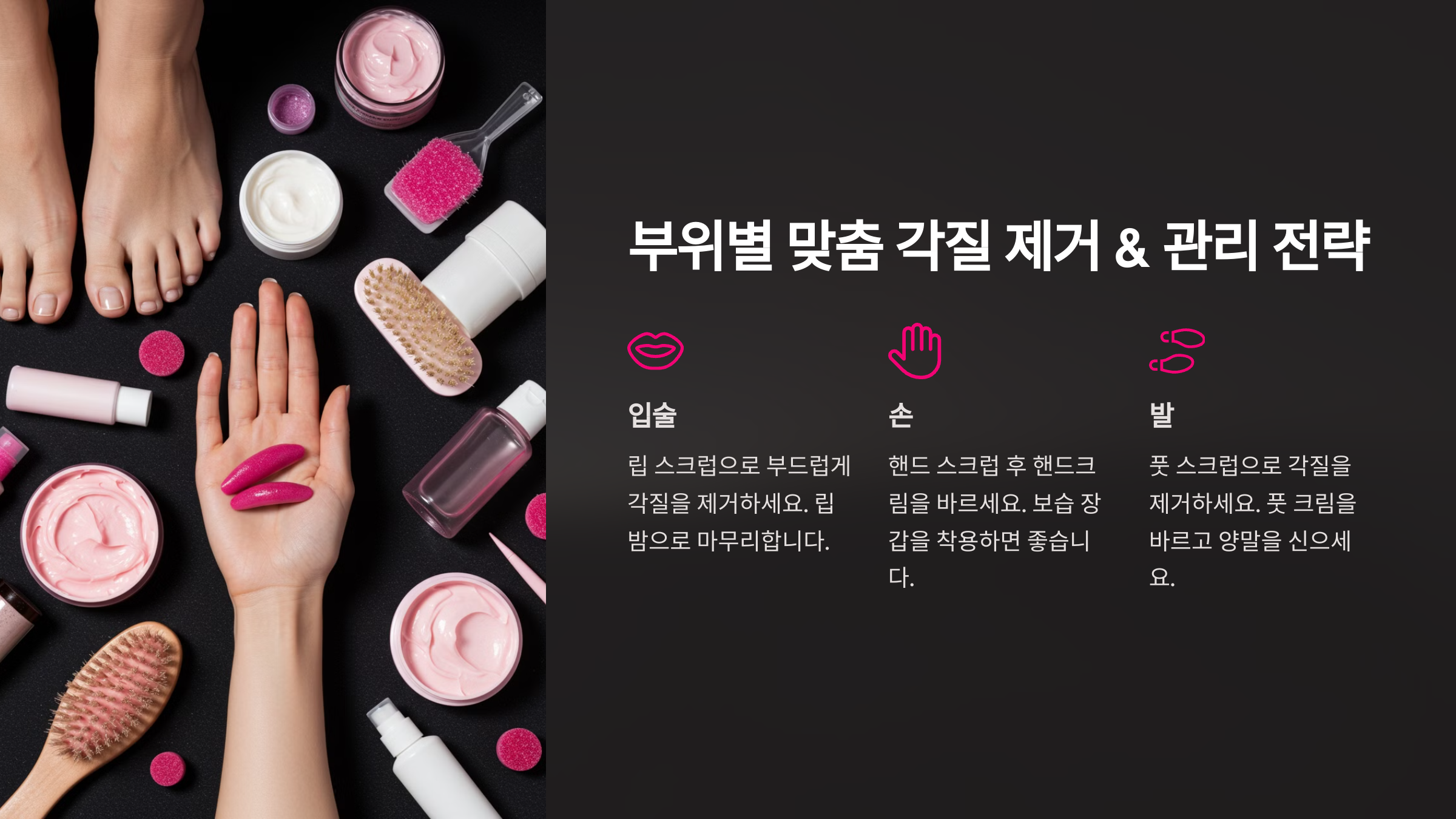 💡 아래에서 부위별 각질 관리 꿀팁을 확인하고, 부드럽고 촉촉한 피부를 유지해 보세요! ✅