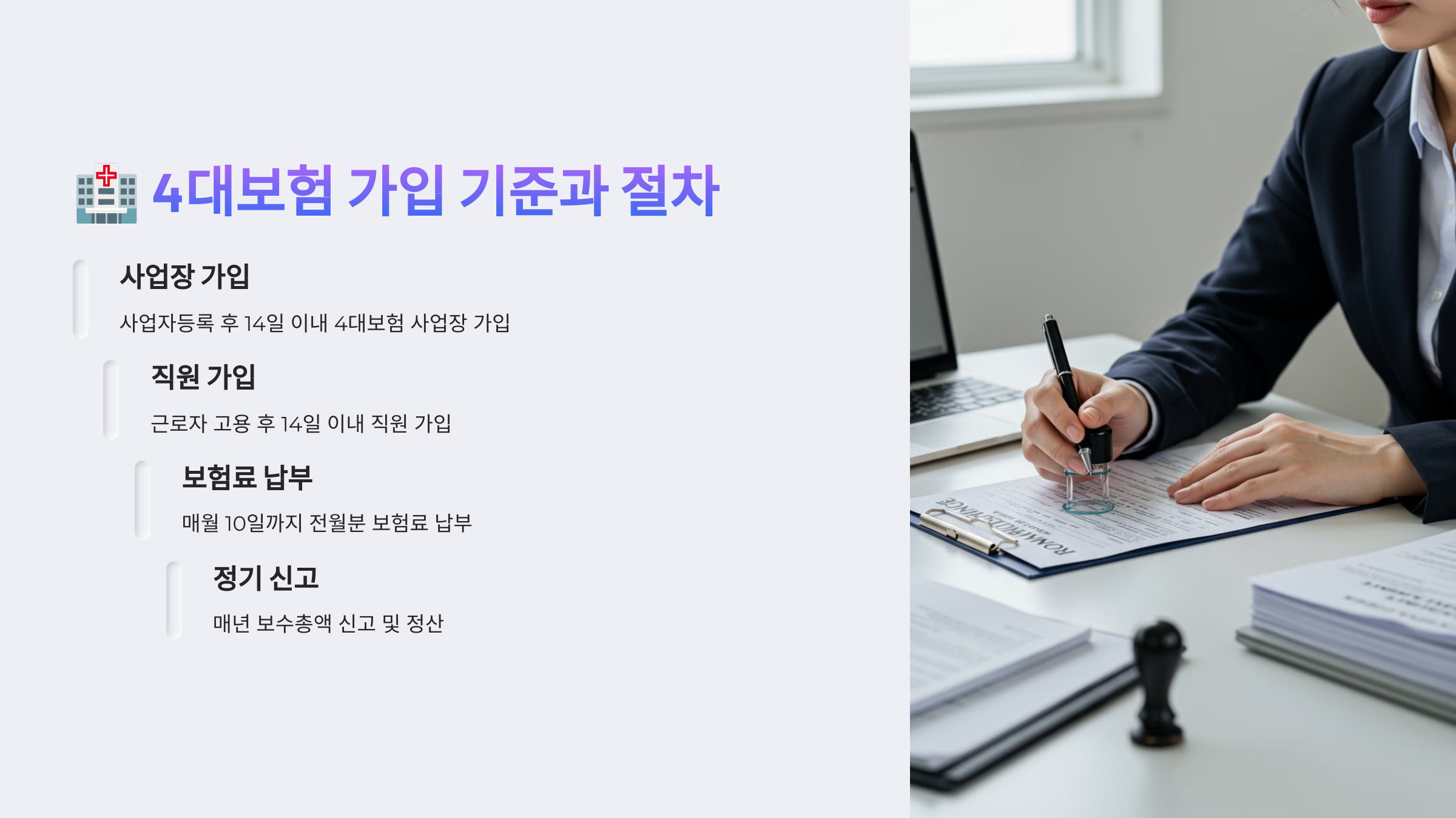 정리하자면, 직원이 있다면 무조건 4대보험 가입은 해야 하고, 계약 후 14일 이내 신고가 원칙이에요. 한 번만 등록해두면 이후는 자동으로 이어지니 초기 대응이 중요해요.